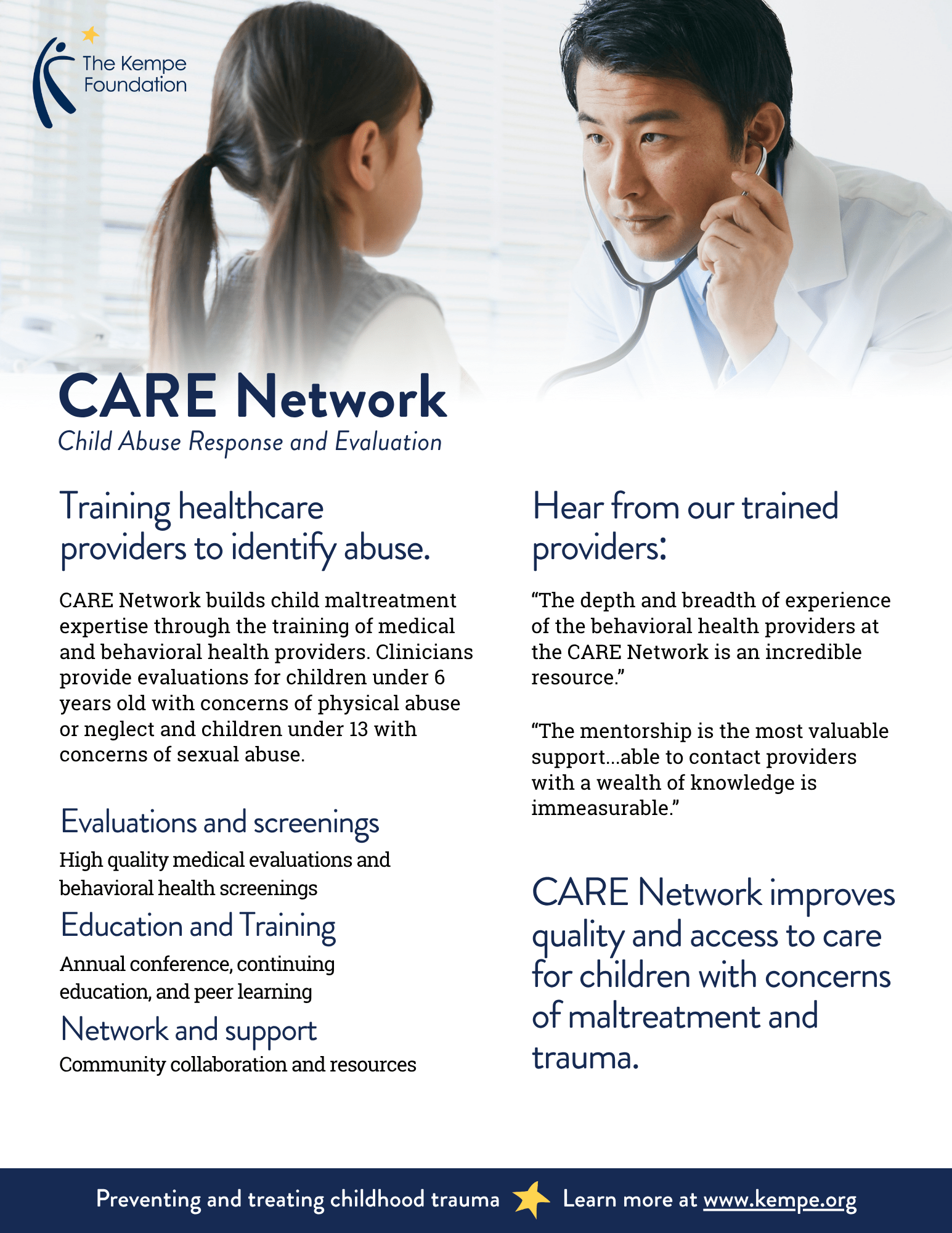The Child Abuse Response and Evaluation (CARE) Network engages health care and behavioral health providers across Colorado with the best education and training on conducting medical exams and behavioral health assessments to identify signs and risks of child maltreatment or trauma.